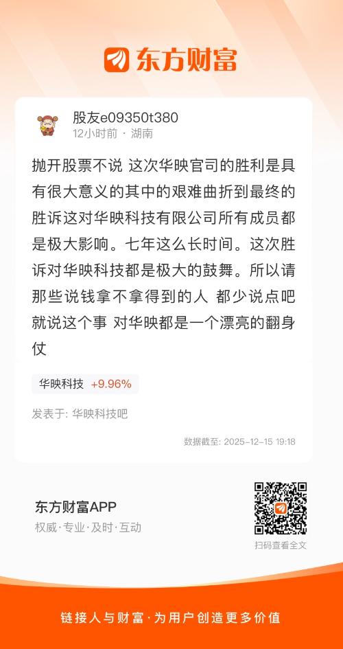 抛开股票不说 这次华映官司的胜利是具有很大意义的其中的艰难曲折到最终的胜诉这对华映科技有限公司所有成员都是极大影响。七年这么长时间。这次胜诉对华映科技都是极大的鼓舞。所以请那些说钱拿不拿得到的人 都少说点吧 就说这个事 对华映都是一个漂亮的翻身仗