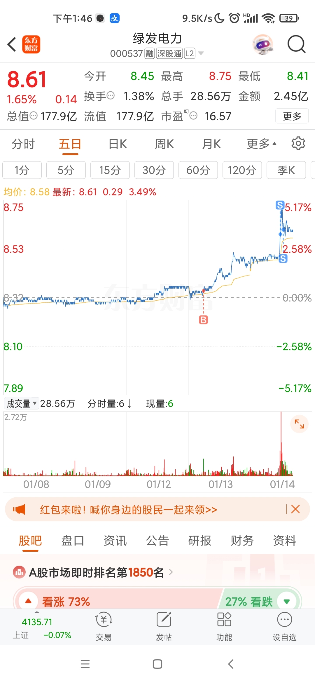 $绿发电力(SZ000537)$ 两天赚6千块钱。挺好的。