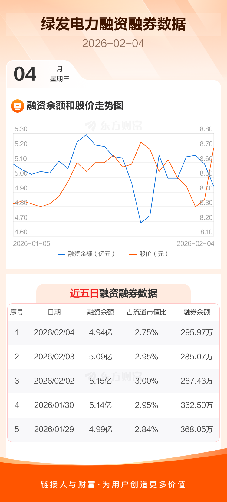 交易所最新数据显示,绿发电力于2026年2月4日获融资买入2676.02万元,融资偿还4104.45万元,当日融资净偿还1428.43万元。目前,该股融资余额4.94亿,占流通市值比例为2.75%。