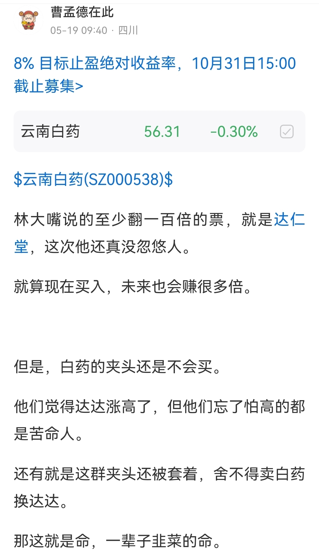 郑重声明:用户在财富号/股吧/博客等社区发表的所有信息(包括但不限于文字、视频、音频、数据及图表)仅代表个人观点,与本网站立场无关,不对您构成任何投资建议,据此操作风险自担。请勿相信代客理财、免费荐股和炒股培训等宣传内容,远离非法证券活动。请勿添加发言用户的手机号码、公众号、微博、微信及QQ等信息,谨防上当受骗!