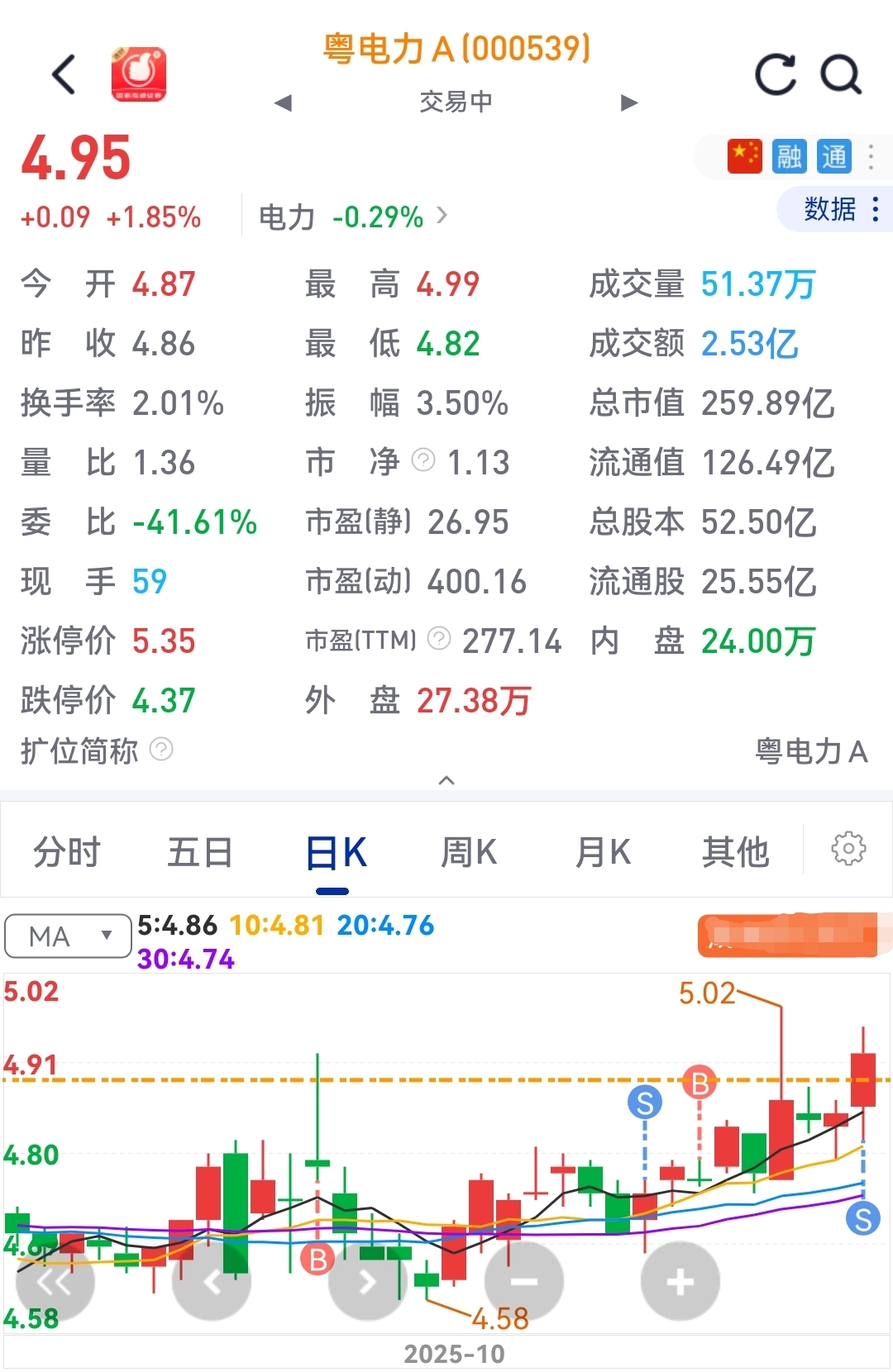 $粤电力A(SZ000539)$ 昨天走了一点,今天接回来。