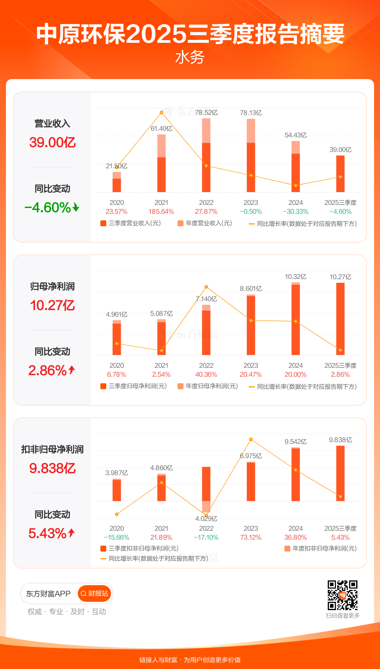 中原环保10月30日发布2025年三季报显示,公司前三季实现营业收入39.00亿元,同比下滑4.60%;归母净利润10.27亿元,同比增长2.86%;扣非归母净利润9.84亿元,同比增长5.43%。