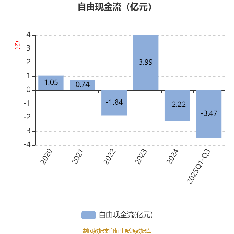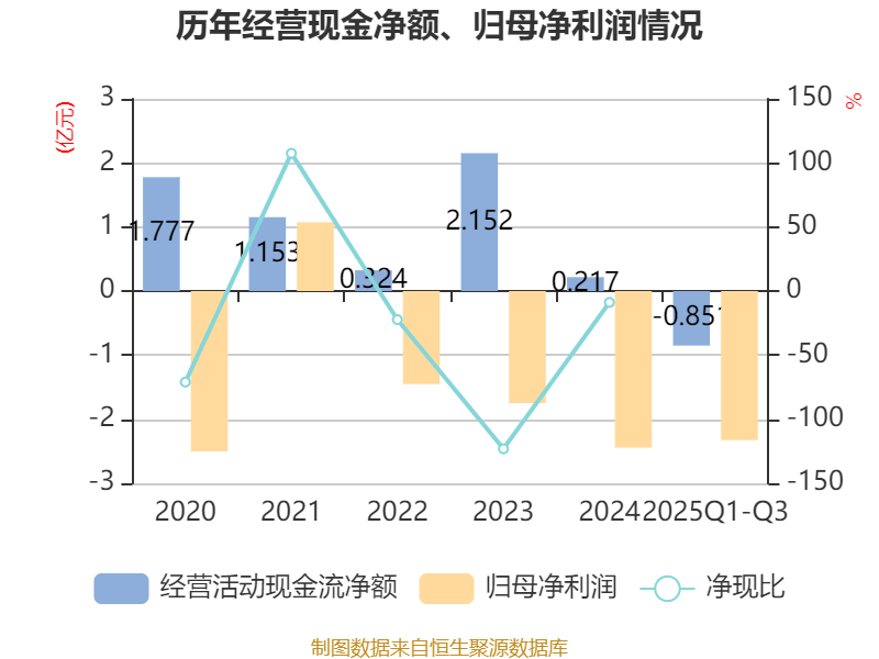 2025年前三季度,公司经营活动现金流净额为-8510.6万元,同比减少1.03亿元;筹资活动现金流净额-1.04亿元,同比减少6130.48万元;投资活动现金流净额9900.26万元,上年同期为-1.04亿元。