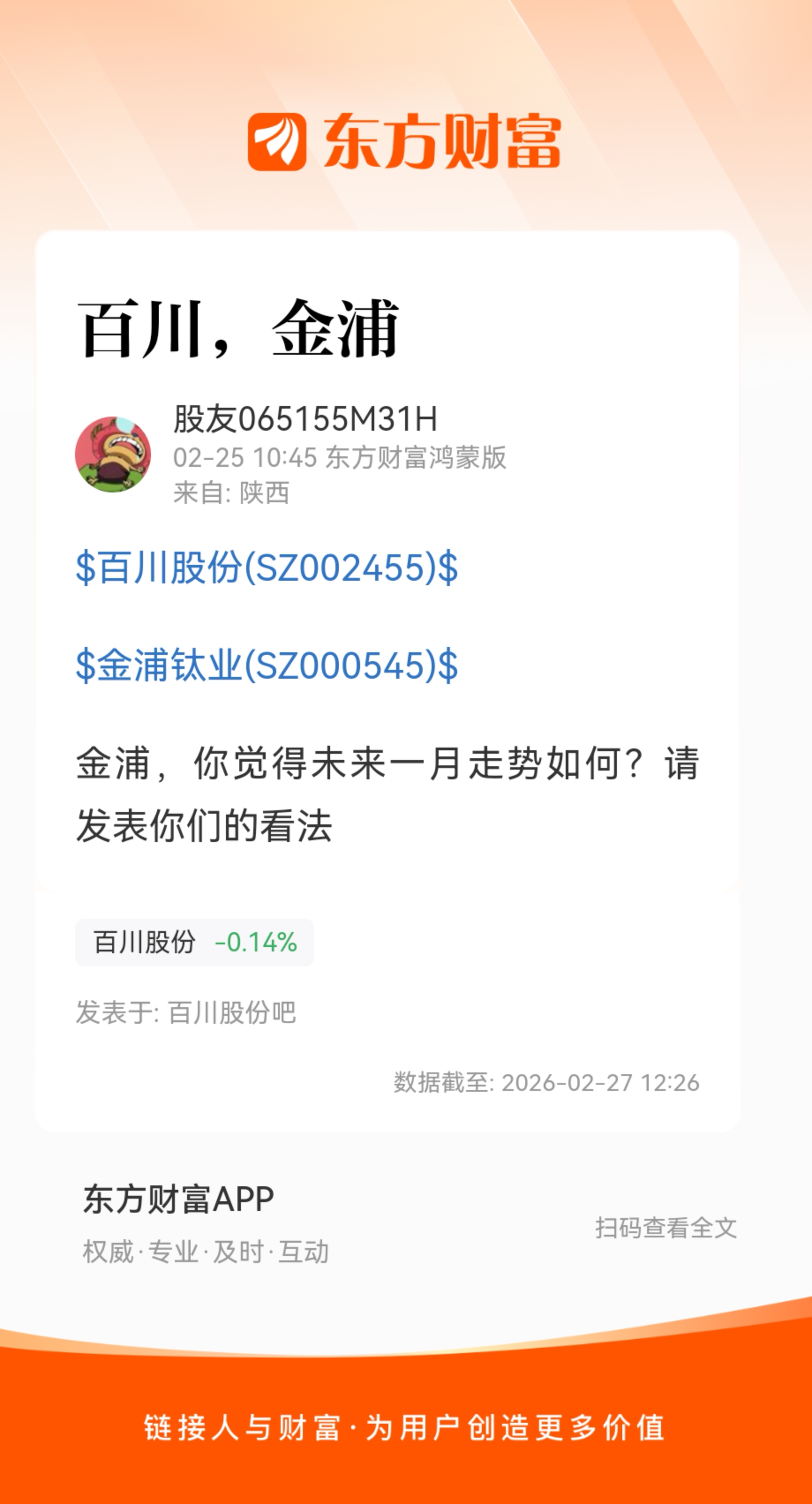 温馨提示: 1.根据《证券法》规定,禁止编造、传播虚假信息或者误导性信息,扰乱证券市场;2.用户在本社区发表的所有资料、言论等仅代表个人观点,与本网站立场无关,不对您构成任何投资建议。用户应基于自己的独立判断,自行决定证券投资并承担相应风险。《东方财富社区管理规定》