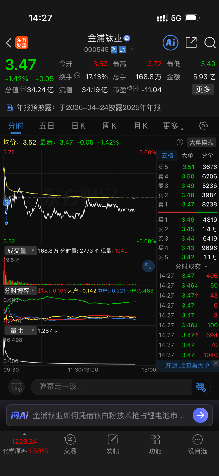 $金浦钛业(SZ000545)$ 卖深渊了
