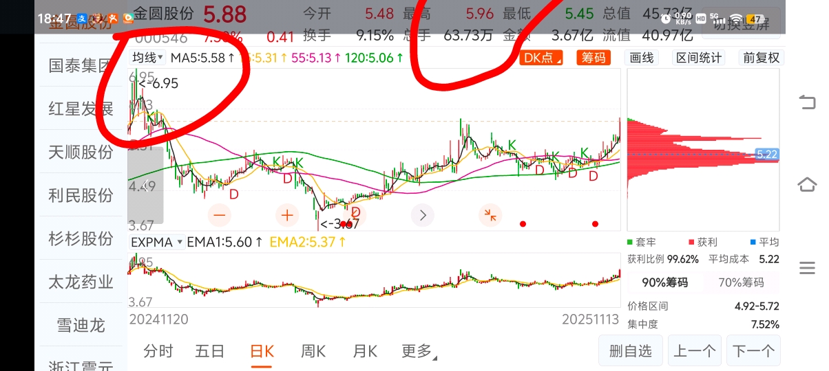 $金圆股份(SZ000546)$ 突破次高5.94回落,更高的高点6.95。今天盘中最高价5.96。不愿意花钱的小庄,一字直接干到8块再放人进来