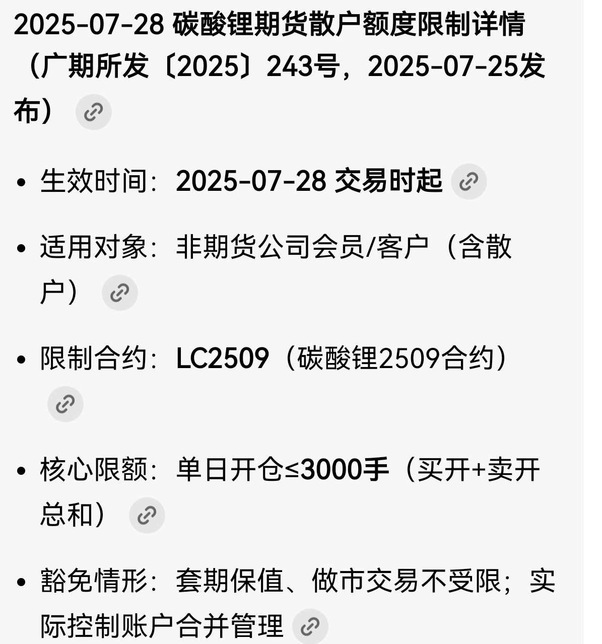 $金圆股份(SZ000546)$ 2025年7月28日,也是广期所针对碳酸锂期货购买进行限购,结果导致当天期货大跌8%,并且连续数天阴跌。因此,这次广期所再次出手,也会导致周一碳酸锂期货下跌,但是影响时间可能会比之前的短一些。