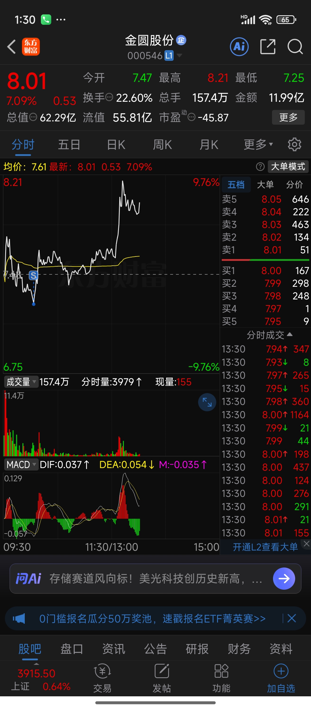 $金圆股份(SZ000546)$ 全天最低价卖飞了