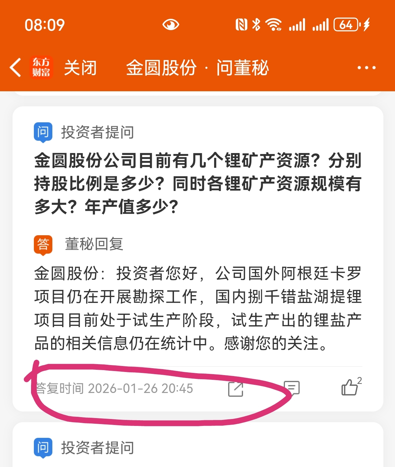 $金圆股份(SZ000546)$ 董秘1月26号还在回复阿根廷卡罗项目仍在勘探,30号年报预报就说停止项目了!这不构成信披违规误导投资者吗?