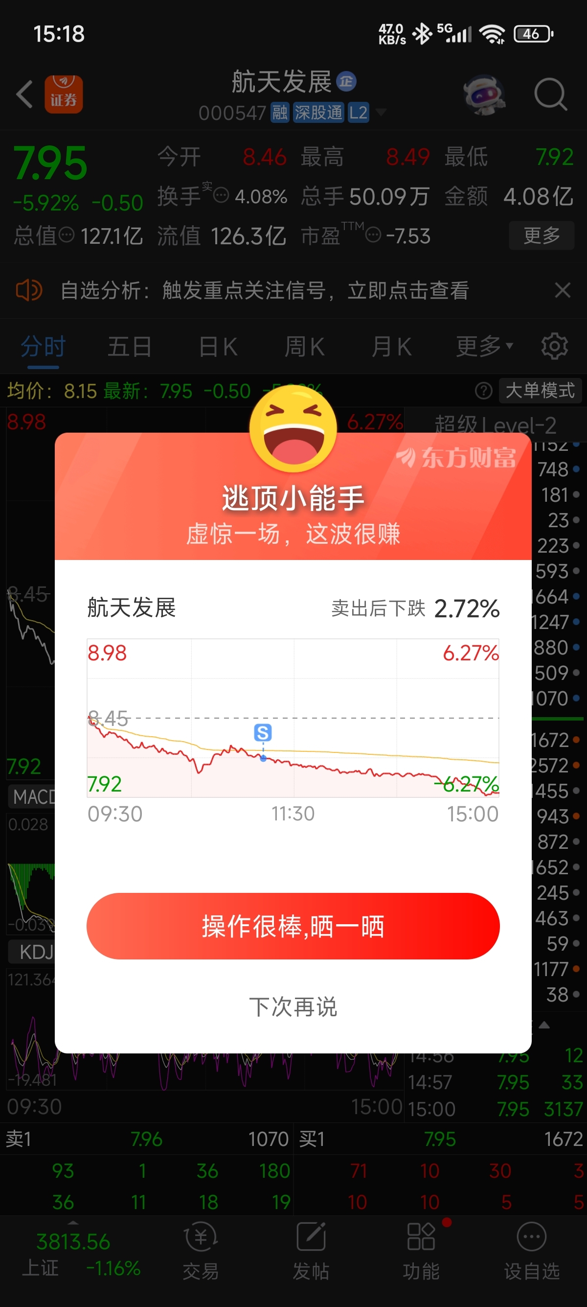 $航天发展(SZ000547)$ 扛不住了,留了100股,不算割肉,我这是战略性撤退,我还会回来的……
