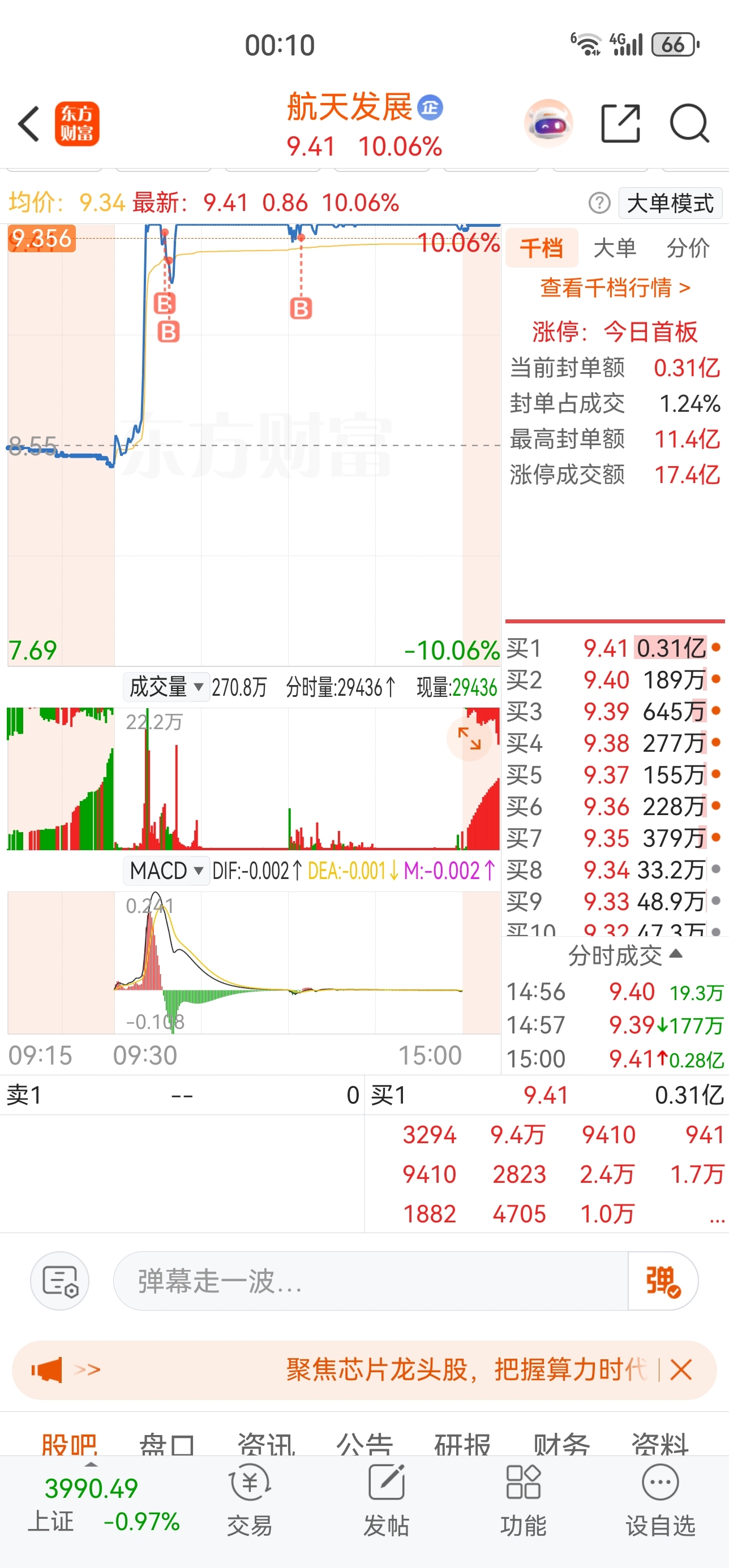 $航天发展(SZ000547)$ 第一个买点纯打板,第二个我在想开板这么久下不去位置也不高肯定洗盘(回封了后悔没敢多买),第三个一样坚持看多,少加点仓。后边老开就不敢了。现在我又看了看K线,我有点害怕周一开盘了。