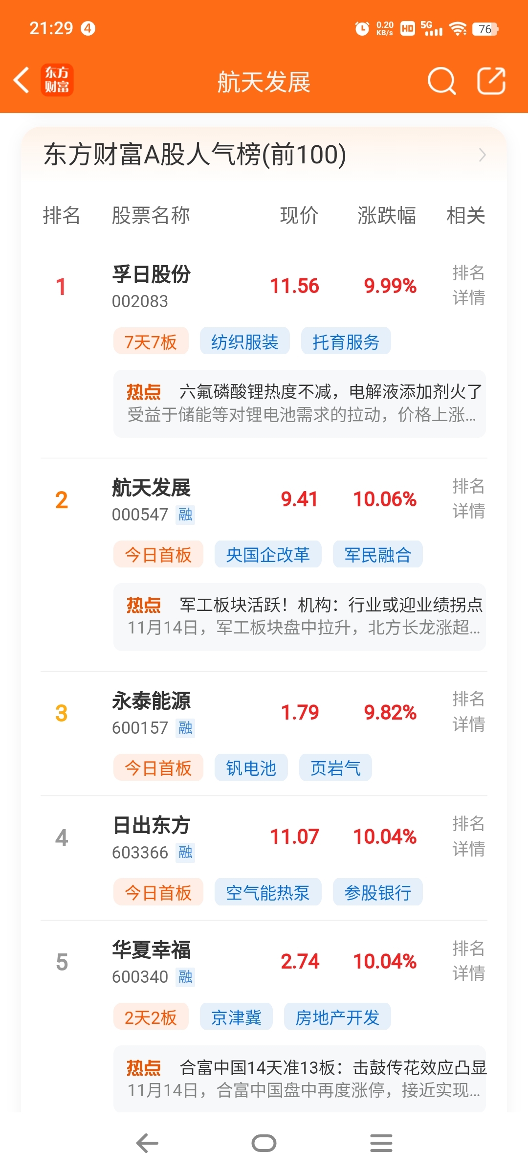 $航天发展(SZ000547)$ 看一下这人气前五排行榜,哪一只最有潜力?竞猜一下哪一只会走得更高更远?