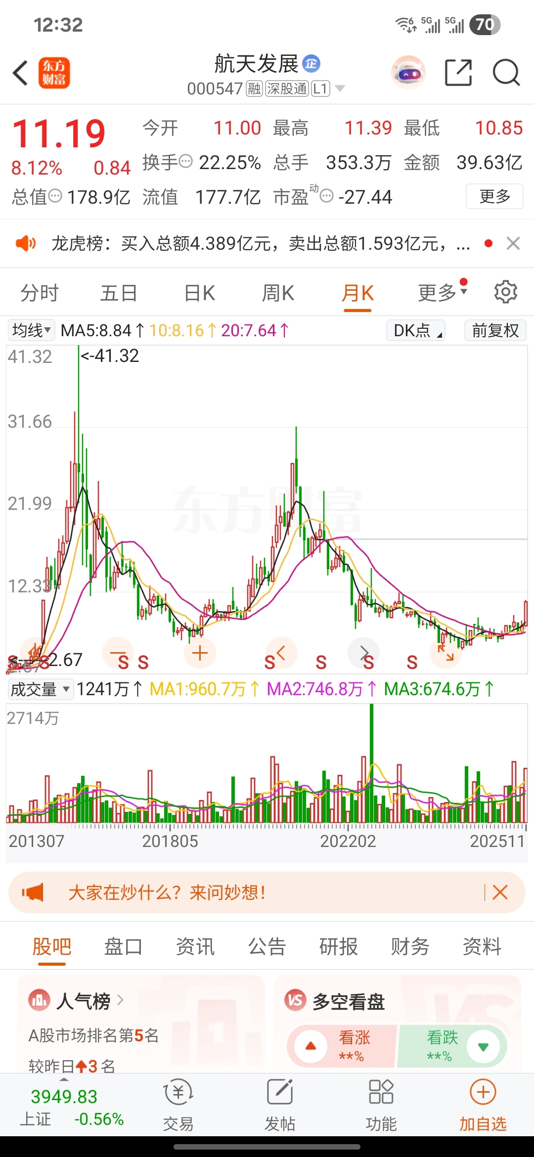 $航天发展(SZ000547)$ 今天优势很好分辨啊,开盘周五的资金兑现了一部分,然后被抢筹到涨停,今天短线情绪不太友好,大盘也在调整,板上又兑现了一部分资金,但是前面9000手以上的买单没有撤单,低位爆量分歧是好事,有人来,有人走,外加上这个题材不错,福建+军工,近期小日子那边也不太平,所以有大资金认可,就看下午多空双方谁更厉害了。月线打开,也才是底部启动。