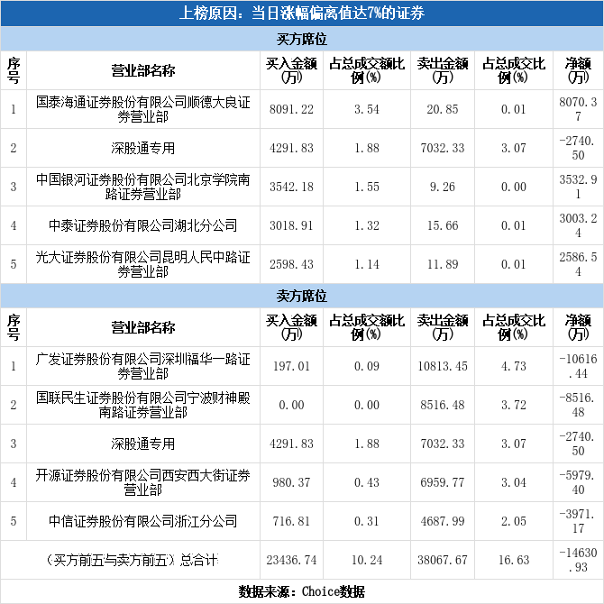 深股通现身龙虎榜,航天发展涨停(11-19)