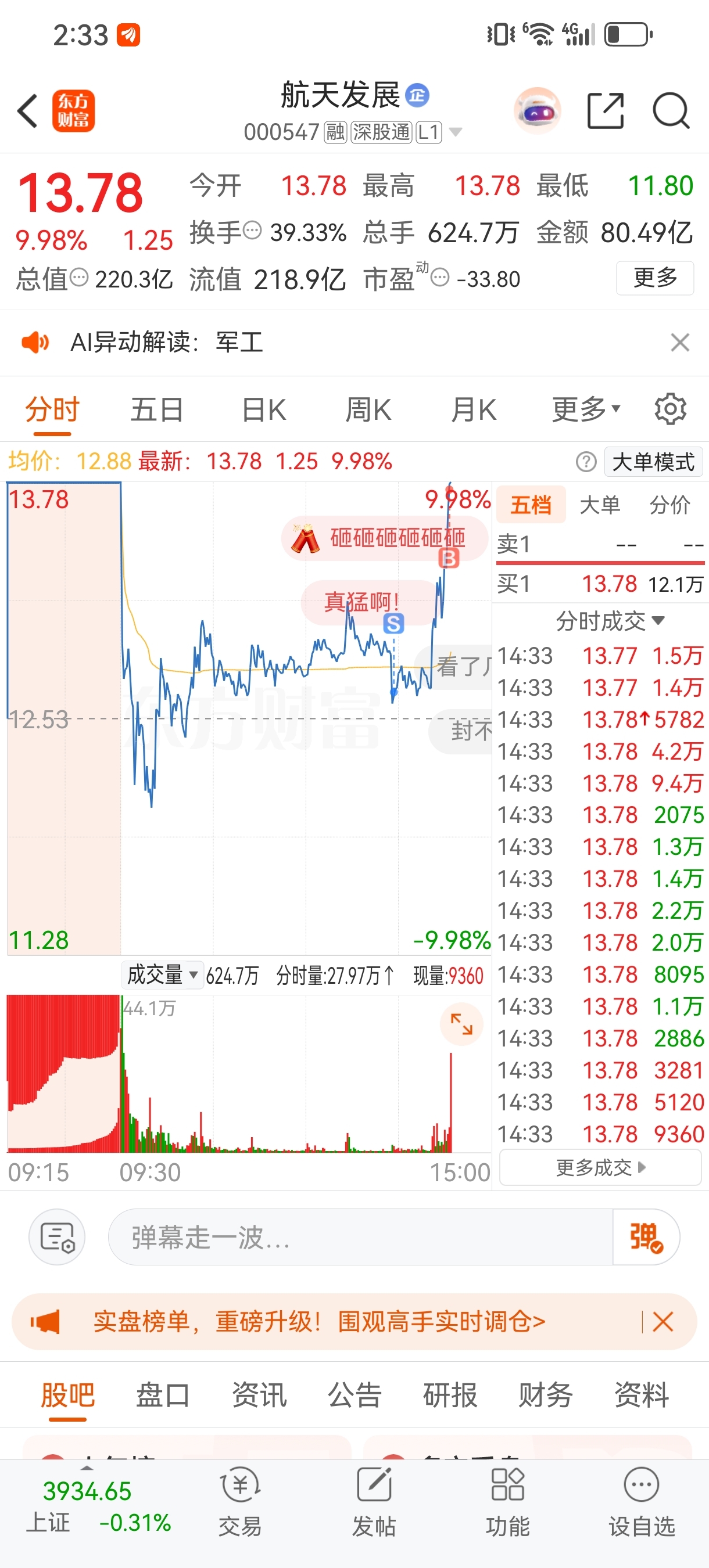 $航天发展(SZ000547)$ 不该盯盘的,早晨-5都没走,下午1个点走了,经典的sb战法