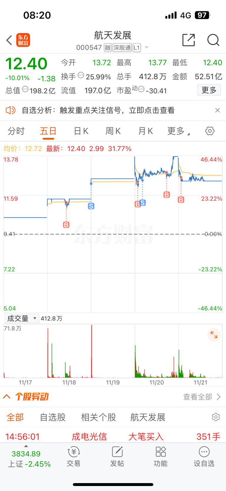 $航天发展(SZ000547)$ 膜拜群总,群总不走我不走,两天的高抛机会格局,目标20以上