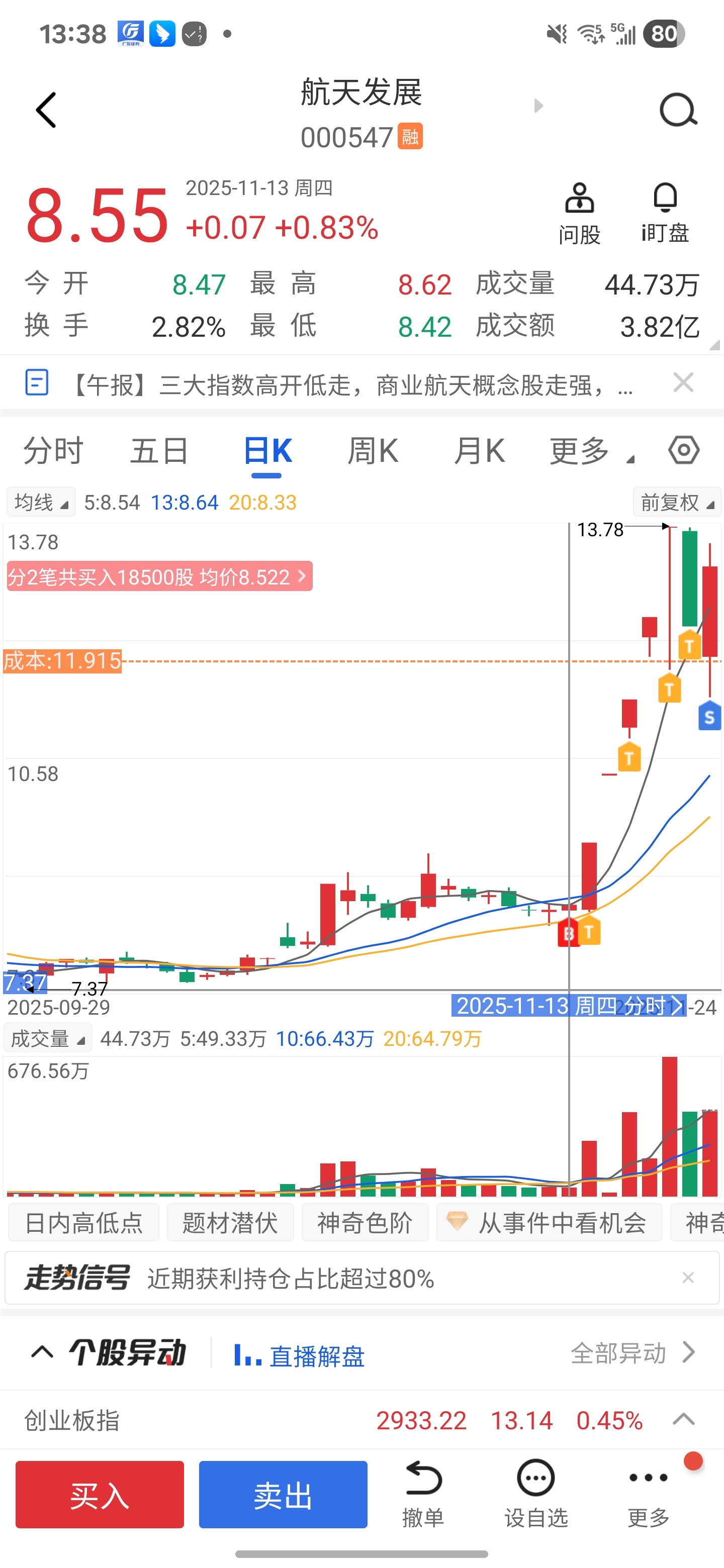 $航天发展(SZ000547)$ 希望连续涨停,留下的兄弟们发财,50个点我先止盈了