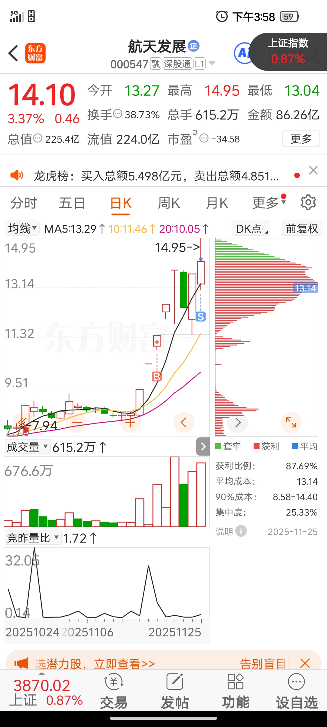 $航天发展(SZ000547)$ 板,很明显,轻轻松松就可以拉起来,就是故意不拉,说明主力要放弃改其他股了,我走了,留下的发财