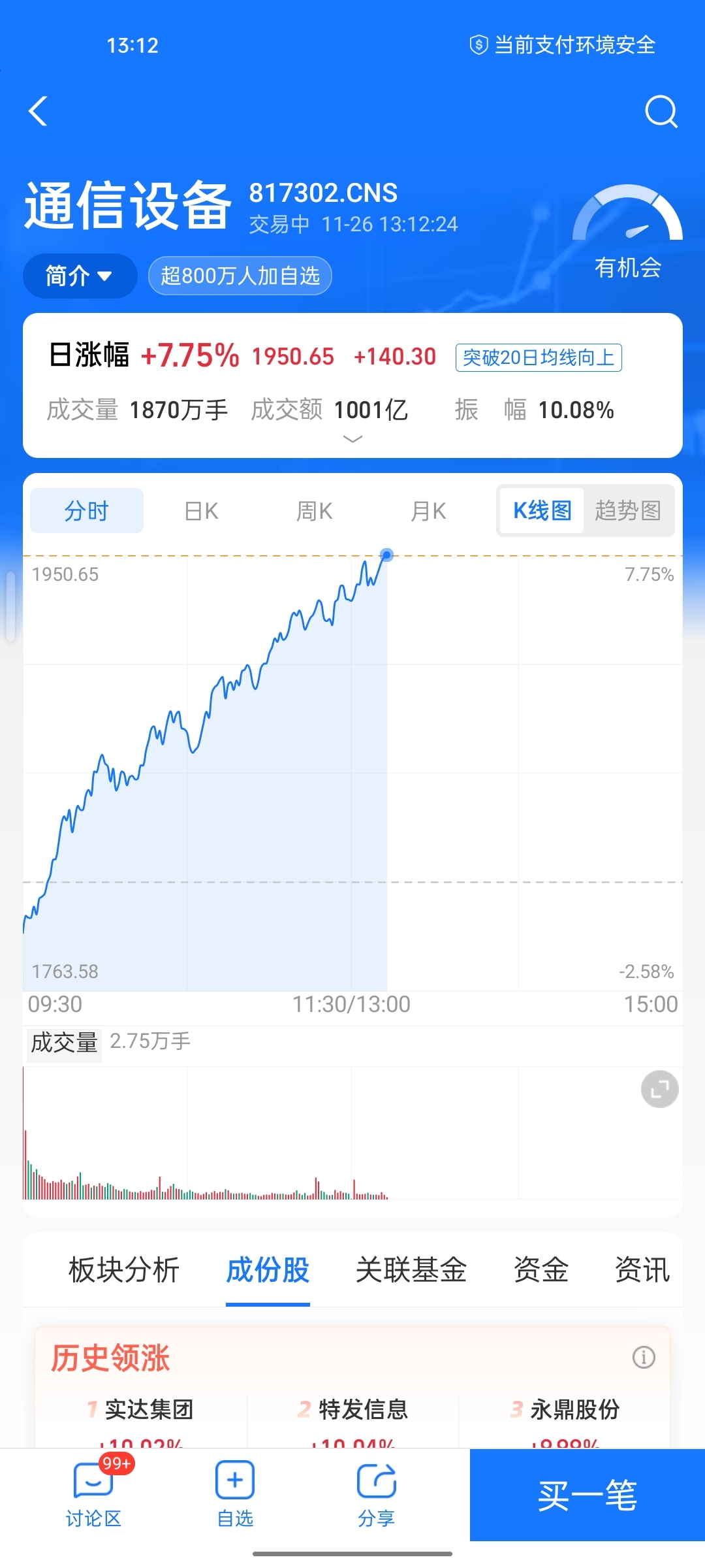 $航天发展(SZ000547)$ 支付宝里面的通信设备马上都要破8个点,这里面才那那么一点