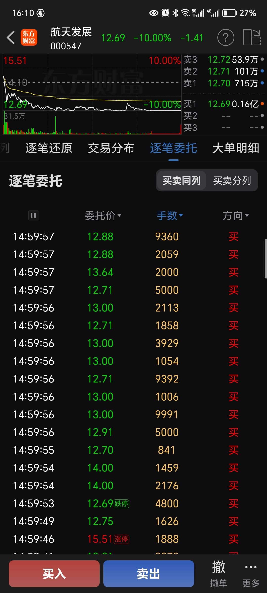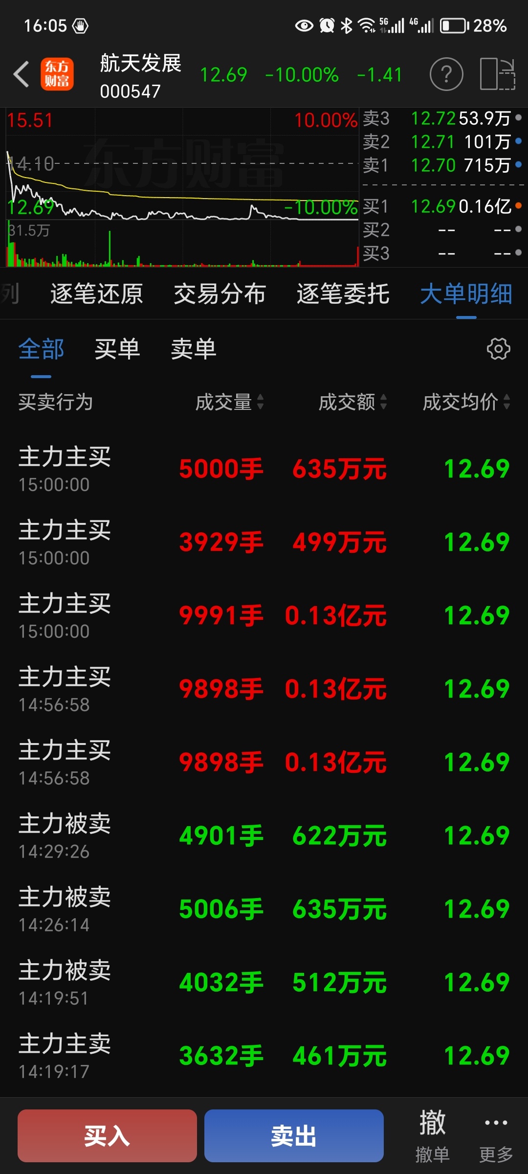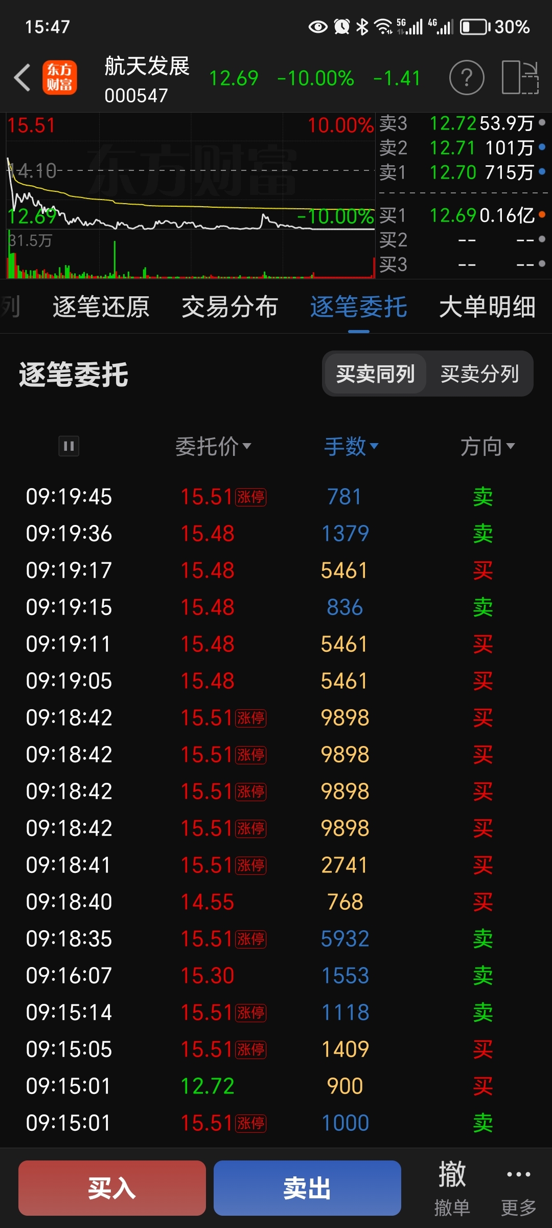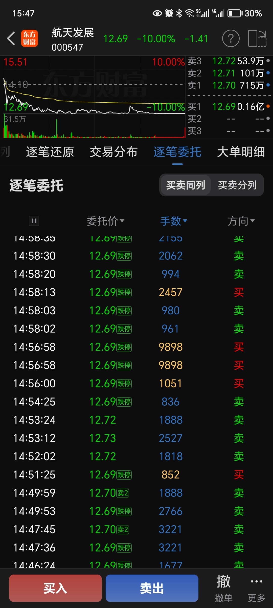 $航天发展(SZ000547)$ 航天发展 群总早上竞价试盘抛压,消息真空期,顺势分单砸盘