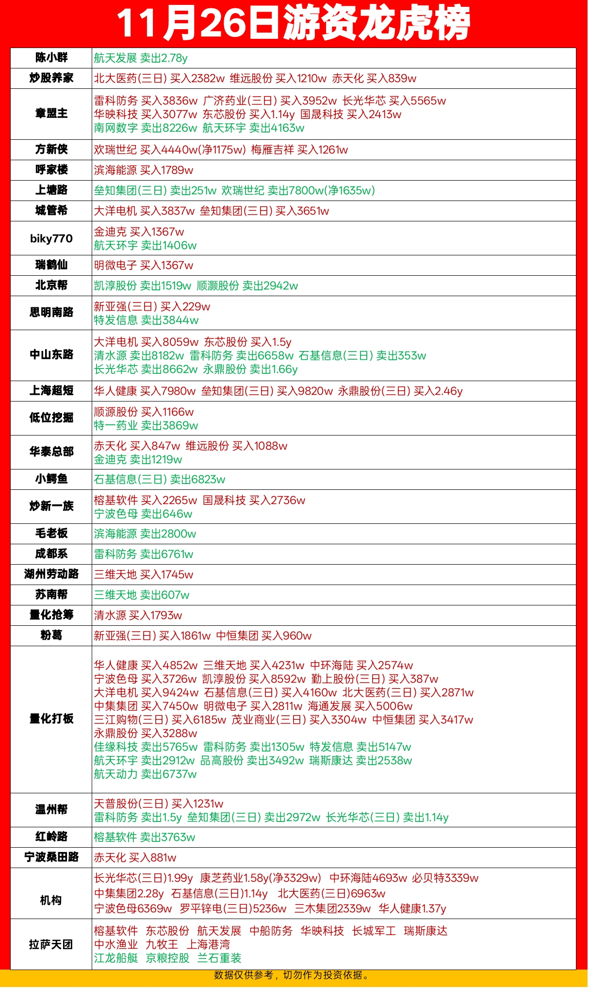 11.26游资龙虎榜,陈小群章盟主呼家楼上榜。