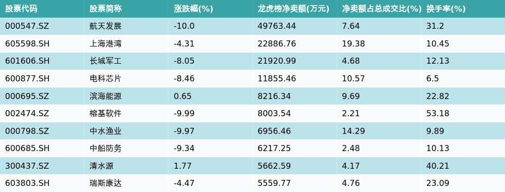南财智讯11月26日电,南财金融终端数据显示,因当日异动登上龙虎榜的个股中,龙虎榜中资金净流出最多的前三位分别是航天发展(000547.SZ)、上海港湾(605598.SH)与长城军工(601606.SH)。其中排名第一的航天发展被净卖出4.98亿元,占总成交金额的7.64%。航天发展收盘下跌10.0%,换手率为31.2%。净卖出额前10个股详情见下图: