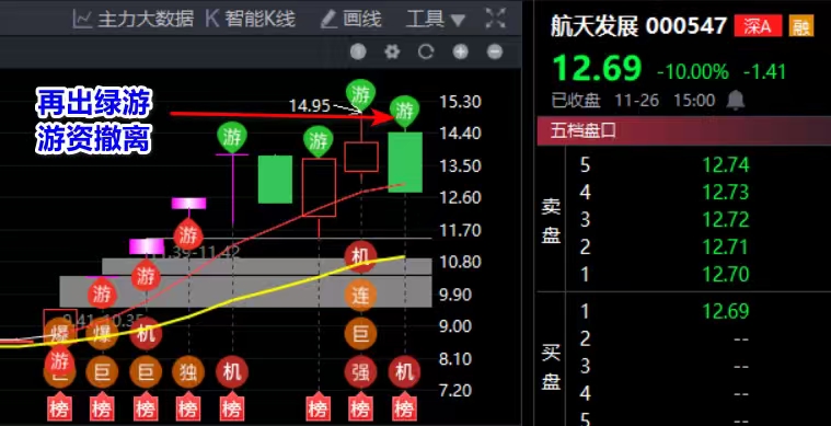 $航天发展(SZ000547)$ 再出绿游,游资出逃。今天是陈总开盘就砸盘出货2.79亿,应该清仓了。同志们昨天撤是对的。#收盘点评#