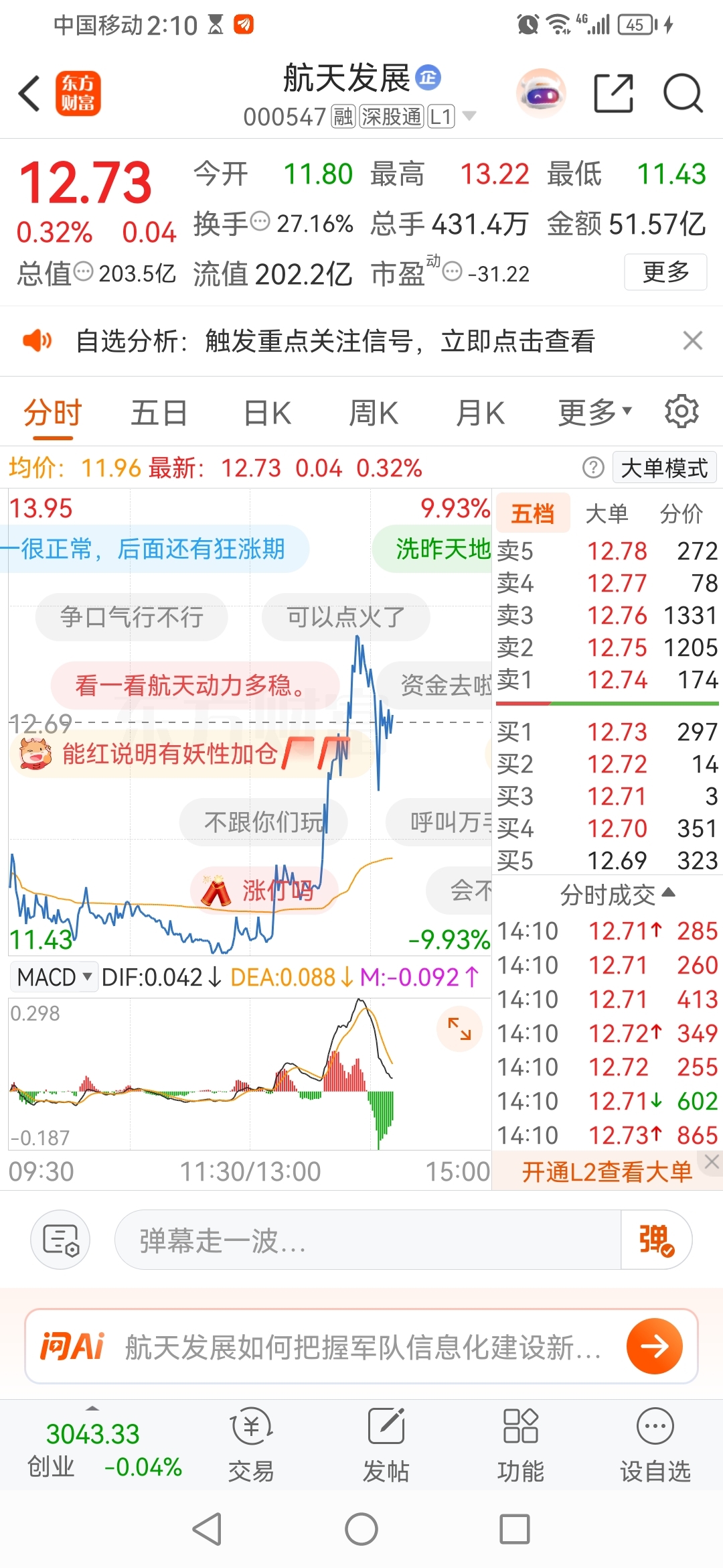 $航天发展(SZ000547)$ 还没进的别着急。换手今天盘尾达不到30以上,明天还有一跌。