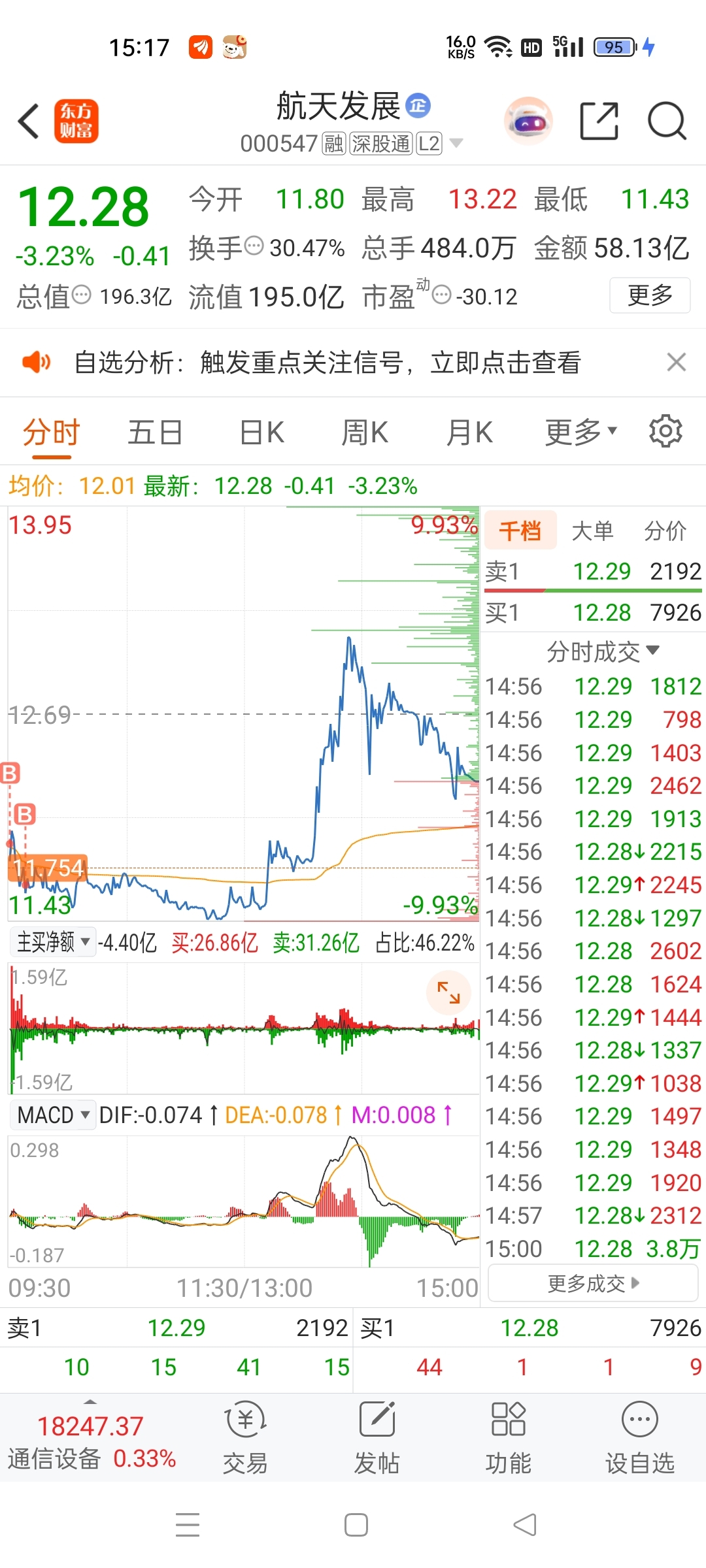 $航天发展(SZ000547)$ 明天看涨,今天虽然说没收红,收在K线上方,龙头不套人,今天走势属实没毛病,今天出去资金明天早盘又来抄底,今天离跌停只差1分,24号11.42拉起来,今天11.43拉起来,仅差一分就跌停,如果主力想跑,早砸地板上了,而且还解放13的筹码,今天均价12元,假阴真阳,看好明天就是。