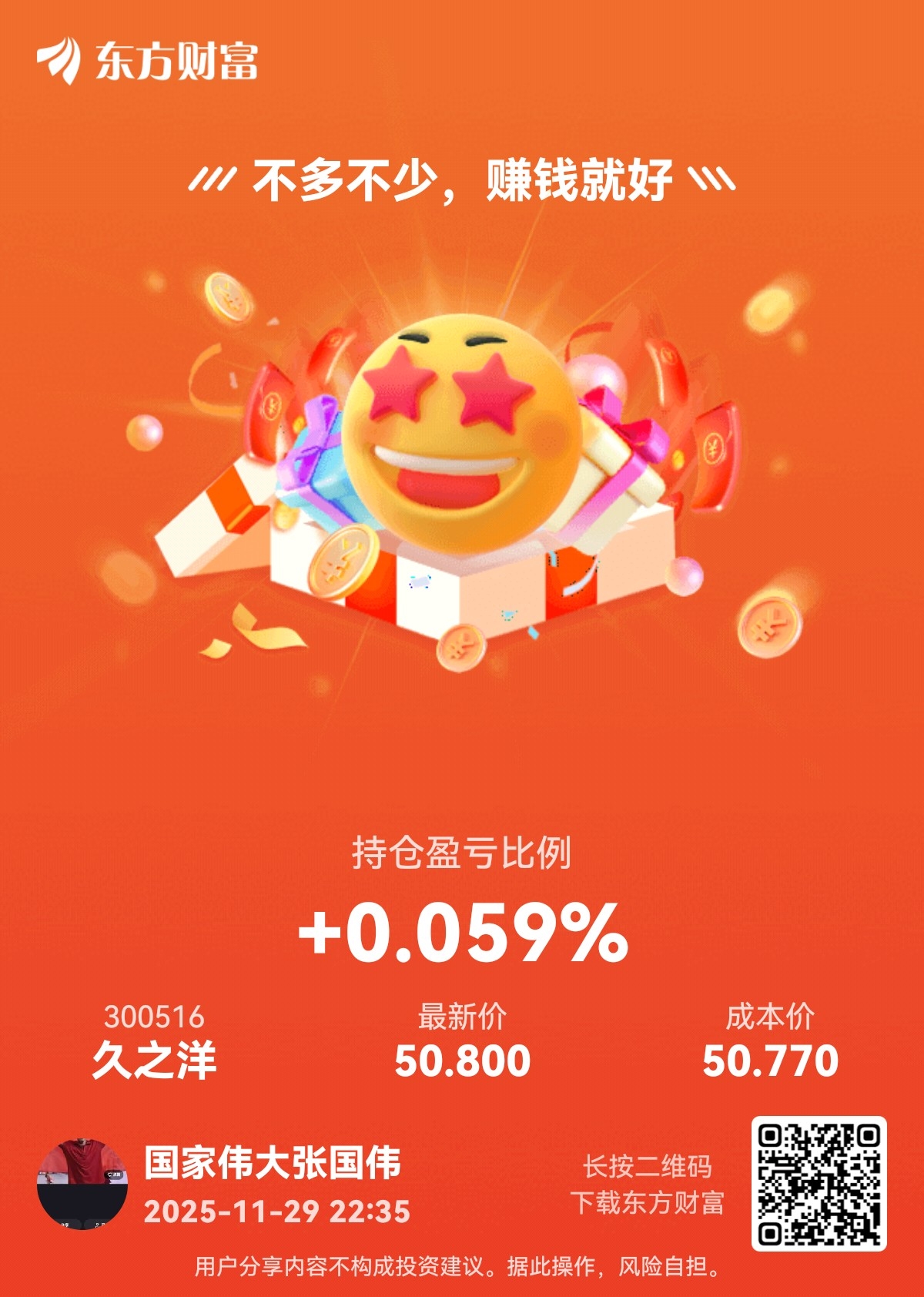 看到商业航天利好消息,我就想买个创业板散户少点选来选去买了久之洋,买完就跌下午2点亏3个点,简直服了,结果2点04出消息航天发展直线涨停封单200万手,买的久之洋直接从绿一个点拉红5个点,收盘回落赚0.05感谢国家队军工航天要爆发了星期一航天发展买不到了估计1000万手封死了。你们真幸运,希望久之洋跟着大涨