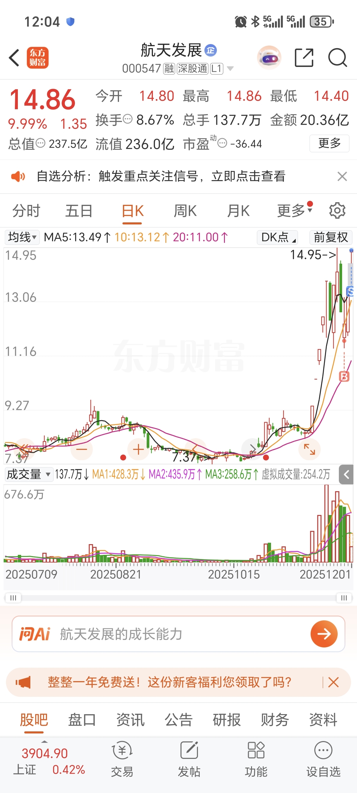 $航天发展(SZ000547)$ 感谢了,三天26个点