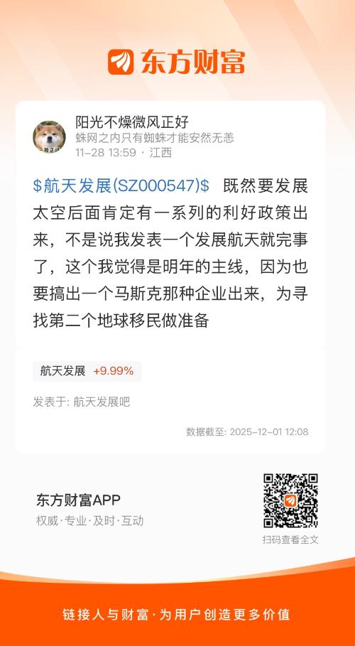 $航天发展(SZ000547)$ 既然要发展太空后面肯定有一系列的利好政策出来,不是说我发表一个发展航天就完事了,这个我觉得是明年的主线,因为也要搞出一个马斯克那种企业出来,为寻找第二个地球移民做准备