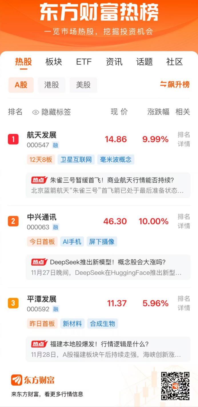 12月1日,两市延续反弹,创业板指领涨。东方财富热股榜前三的股票中,航天发展位列第1,中兴通讯位列第2,平潭发展位列第3。