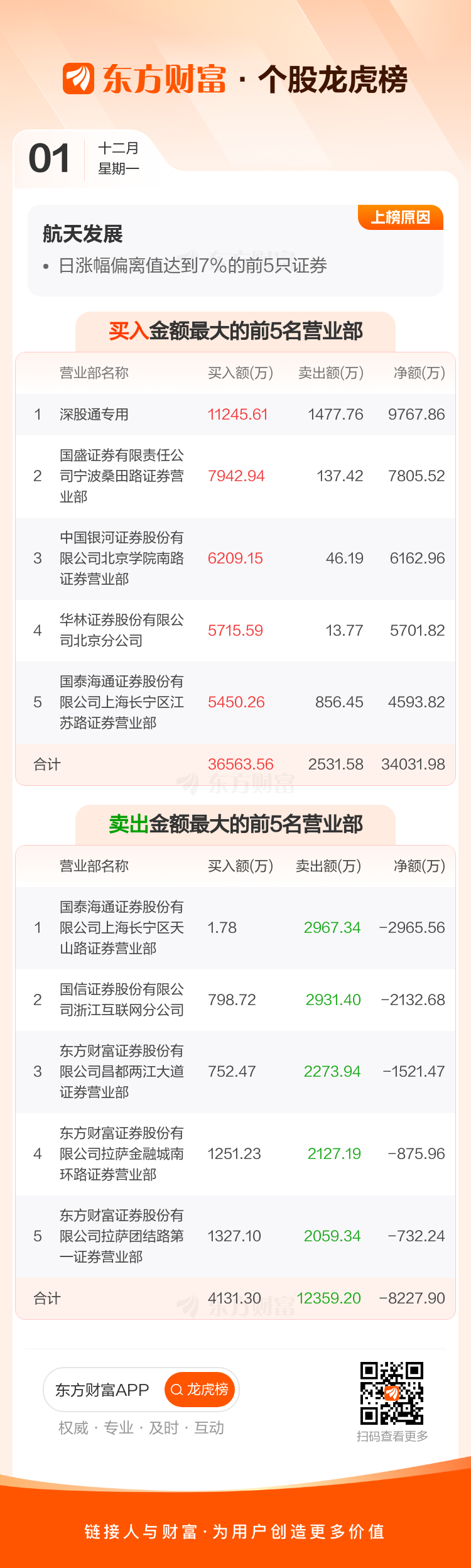交易所2025年12月1日公布的交易公开信息显示,航天发展因成为日涨幅偏离值达到7%的前5只证券上榜。航天发展当日收报14.86元,涨跌幅9.99%,偏离值8.98%,换手率8.98%,成交额21.09亿。