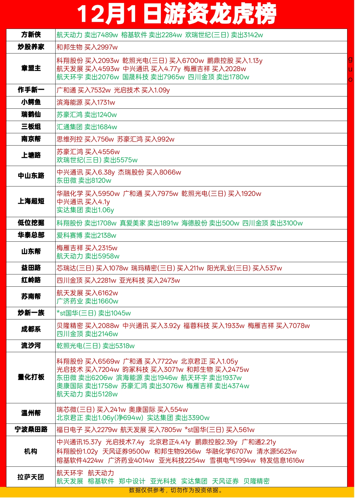 12.1游资龙虎榜,章盟主炒股养家方新侠上榜。