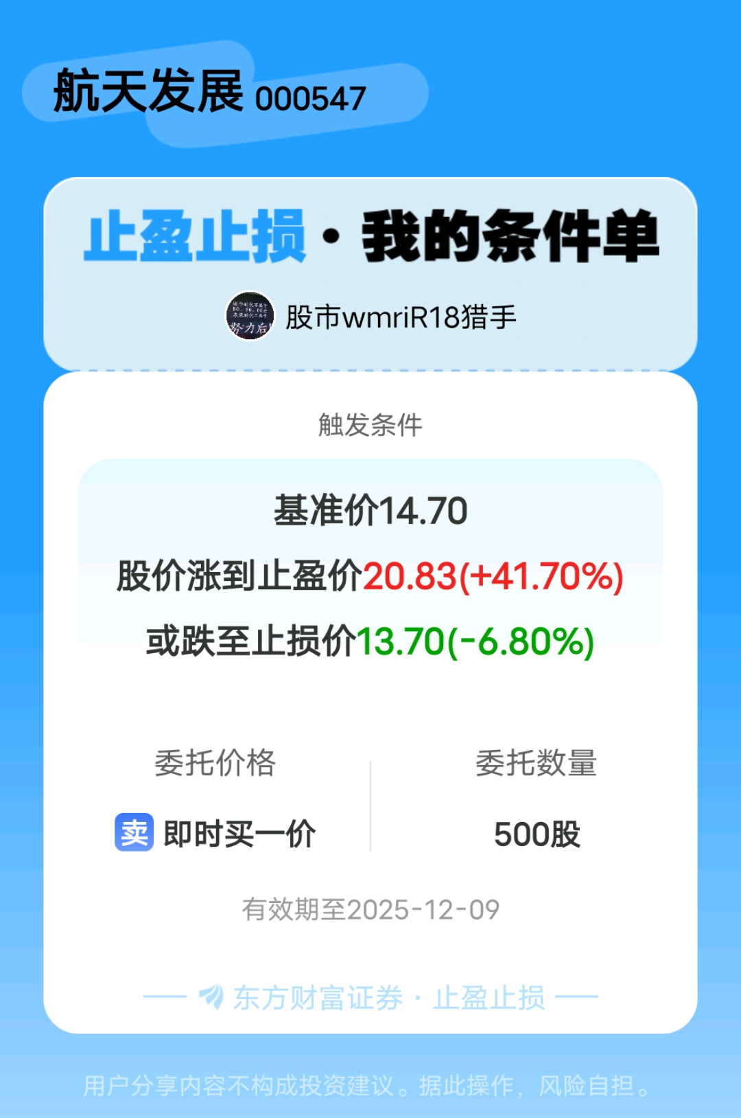 #条件单交流# #止盈止损晒单# 一位股神设置了一个止盈止损条件单,接下来就是见证奇迹的时刻~$航天发展(SZ000547)$