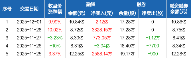 融资方面,当日融资买入3.53亿元,融资偿还1.41亿元,融资净买入2.12亿元,净买入额两市排名第13,连续3日净买入累计2.53亿元。融券方面,融券卖出0股,融券偿还0股,融券余量17.28万股,融券余额256.78万元。融资融券余额合计10.86亿元。