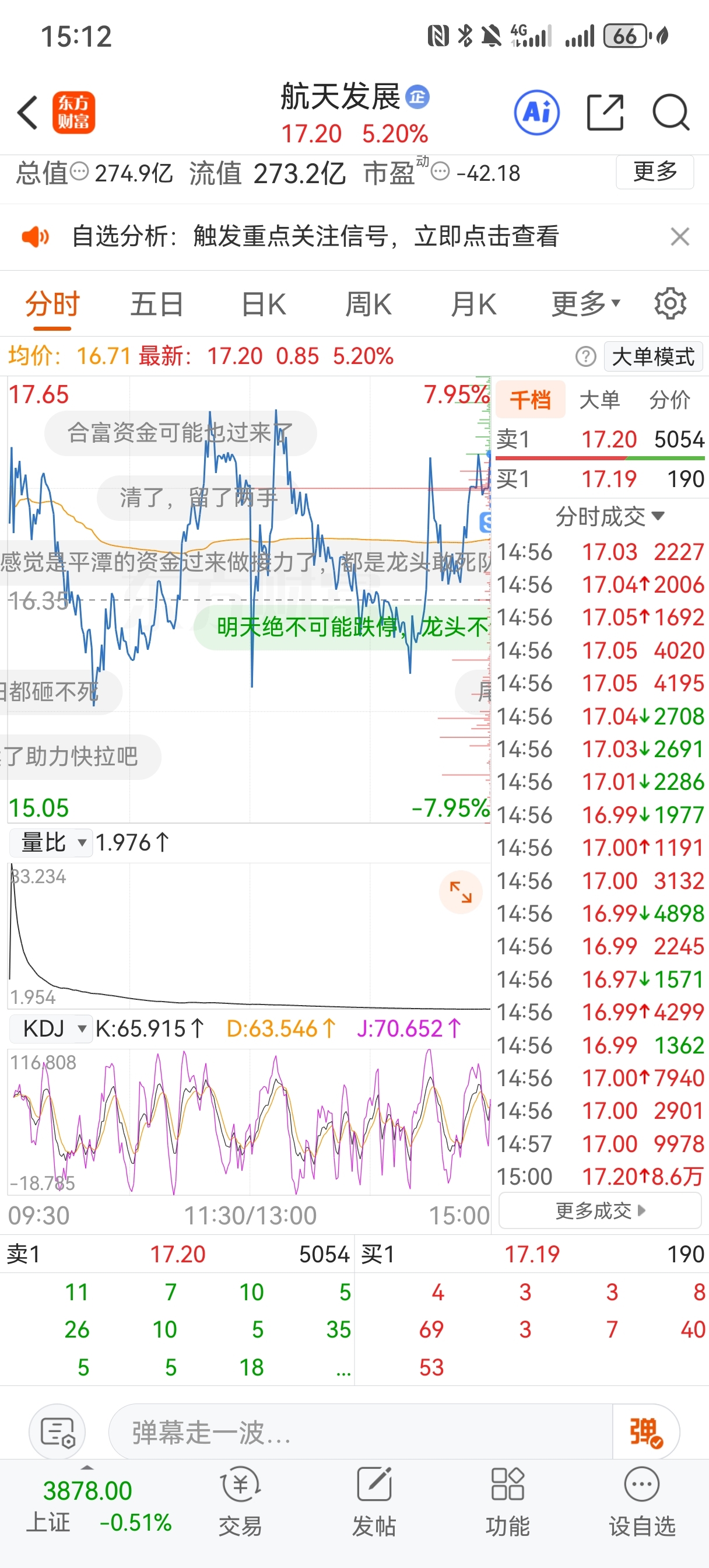 $航天发展(SZ000547)$ 先不管明天啥走势,尾盘先出一半