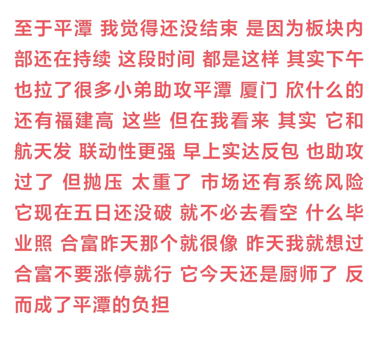 我怎么理解的呢,我昨天是觉得平潭合富不是一个闭环的点。也不认为金富天地是退潮,停牌那段时间已经退潮过了,小周期,这里这三天就很明显,梦天前天尝试过了,昨天金富也去尝试了接力这里的小周期主升无缝衔接,我不认为退潮也不认为平潭结束 ,这两天就是一个分水岭。而平潭要续命就是要看航天和那两个六班,以及今天金富反核动作。你看我主页昨天回复别人的,就是这么说的。