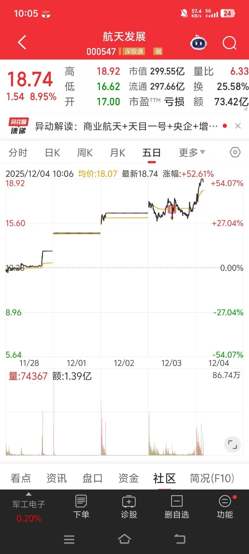 $航天发展(SZ000547)$ 因为没有后排的票助攻,今天预计会反复争夺涨停高地,如果三次开板,或者直接回落到5个点以下,无条件走人。(个人观点,仅供参考)