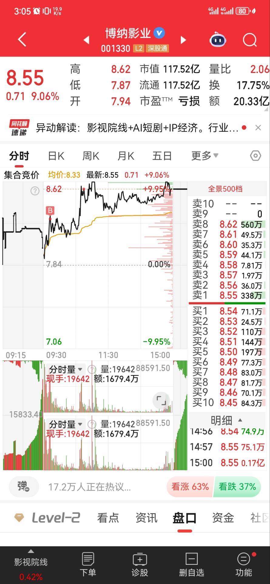 博纳影业:早上资金流入,看图形应该是主力吸筹很久了,也不知道啥逻辑,拉升就上了。