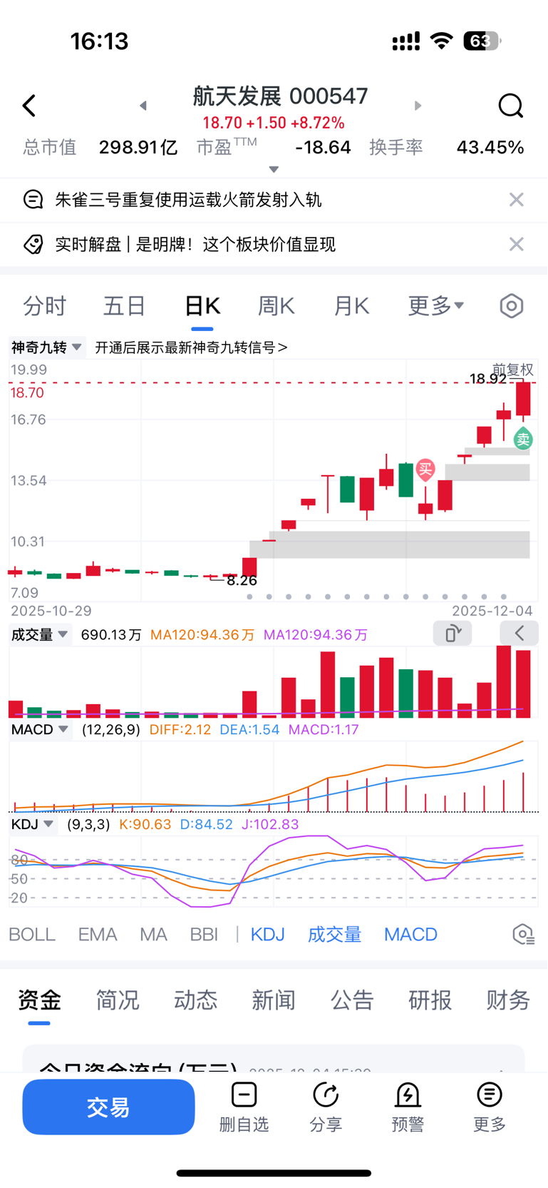 $航天发展(SZ000547)$ 上周四水下负9个点全仓进的,今天早上竞价出了一半,6个多点清仓。留下的发财