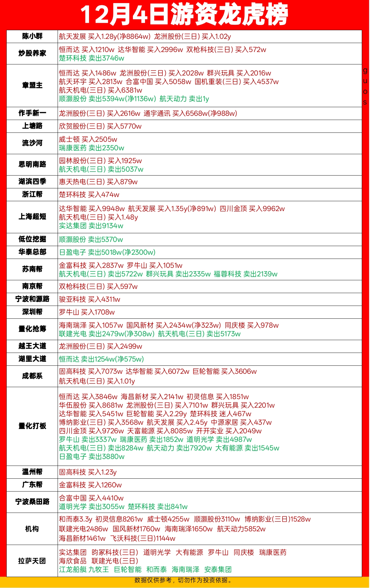12.4游资龙虎榜,陈小群章盟主作手新一上榜。
