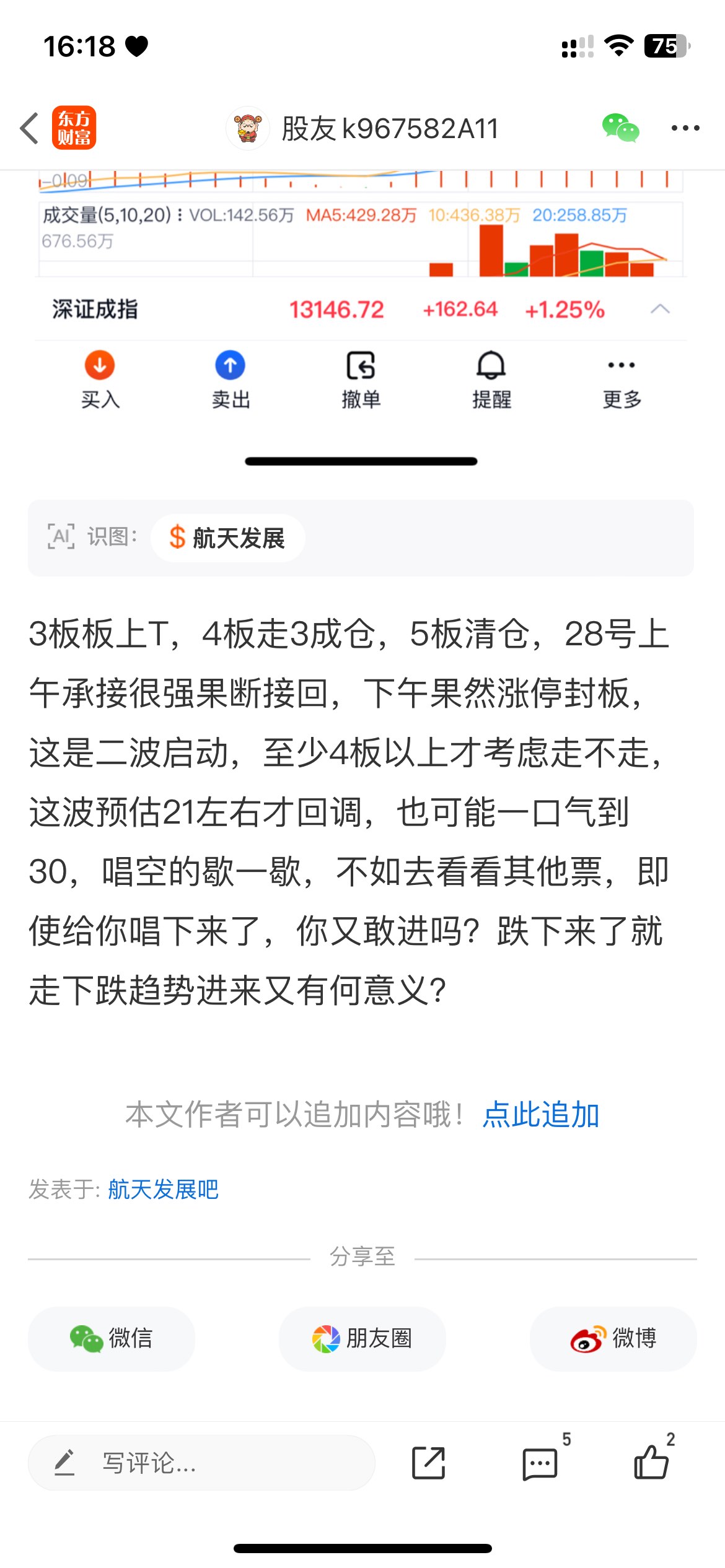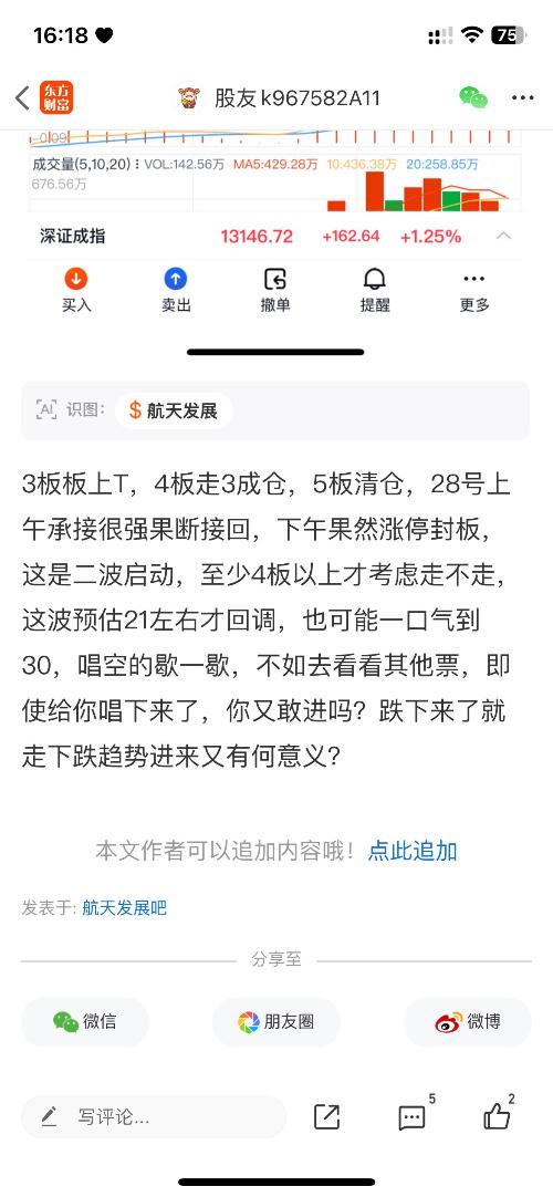 3板板上T,4板走3成仓,5板清仓,28号上午承接很强果断接回,下午果然涨停封板,这是二波启动,至少4板以上才考虑走不走,这波预估21左右才回调,也可能一口气到30,唱空的歇一歇,不如去看看其他票,即使给你唱下来了,你又敢进吗?跌下来了就走下跌趋势进来又有何意义?