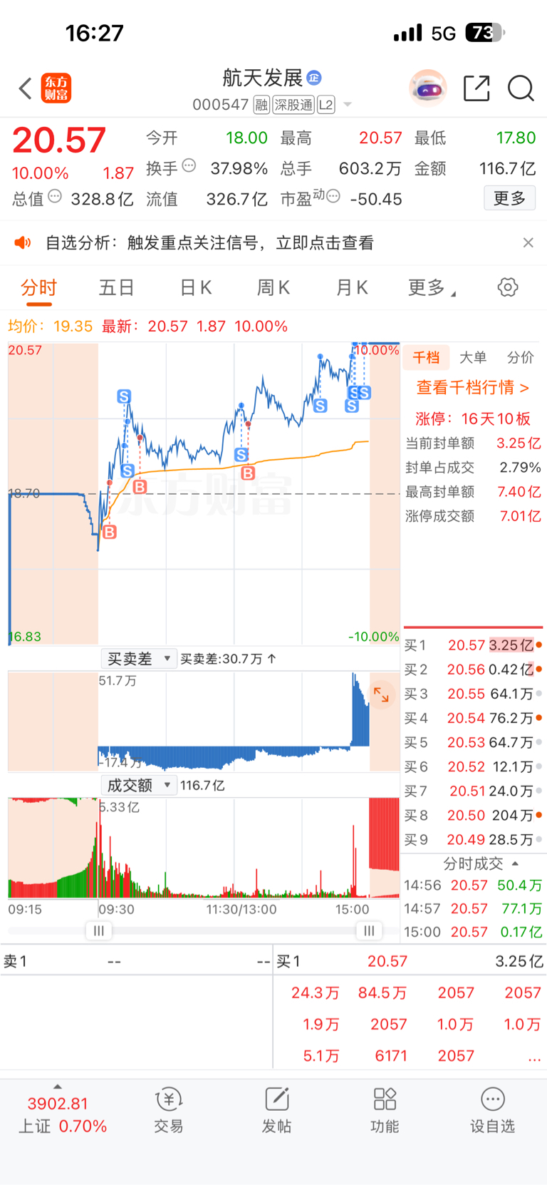 $航天发展(SZ000547)$ 感谢主力,今天这个T做得爽,一天赢利20个点,继续看好,下周再创新高