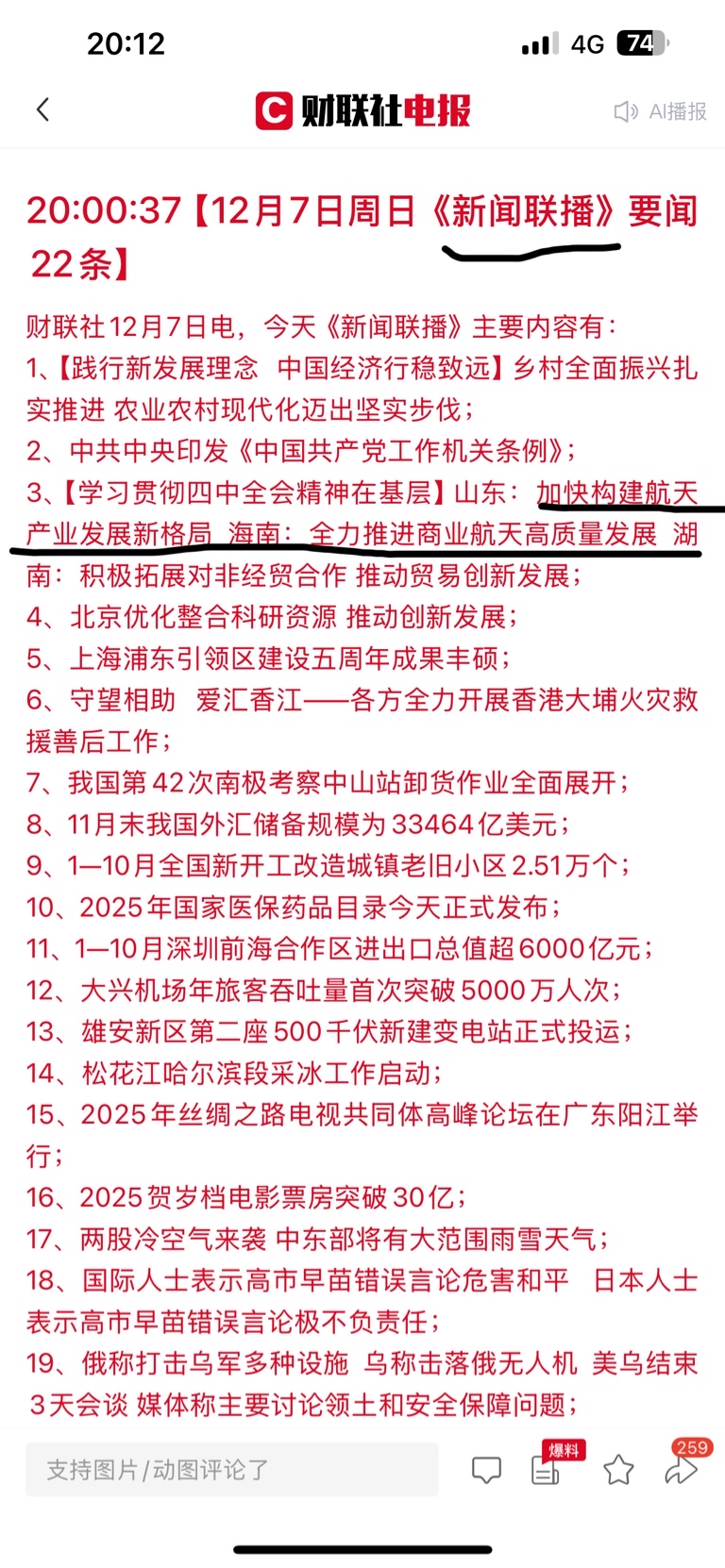 $航天发展(SZ000547)$ 今天滴新闻联播