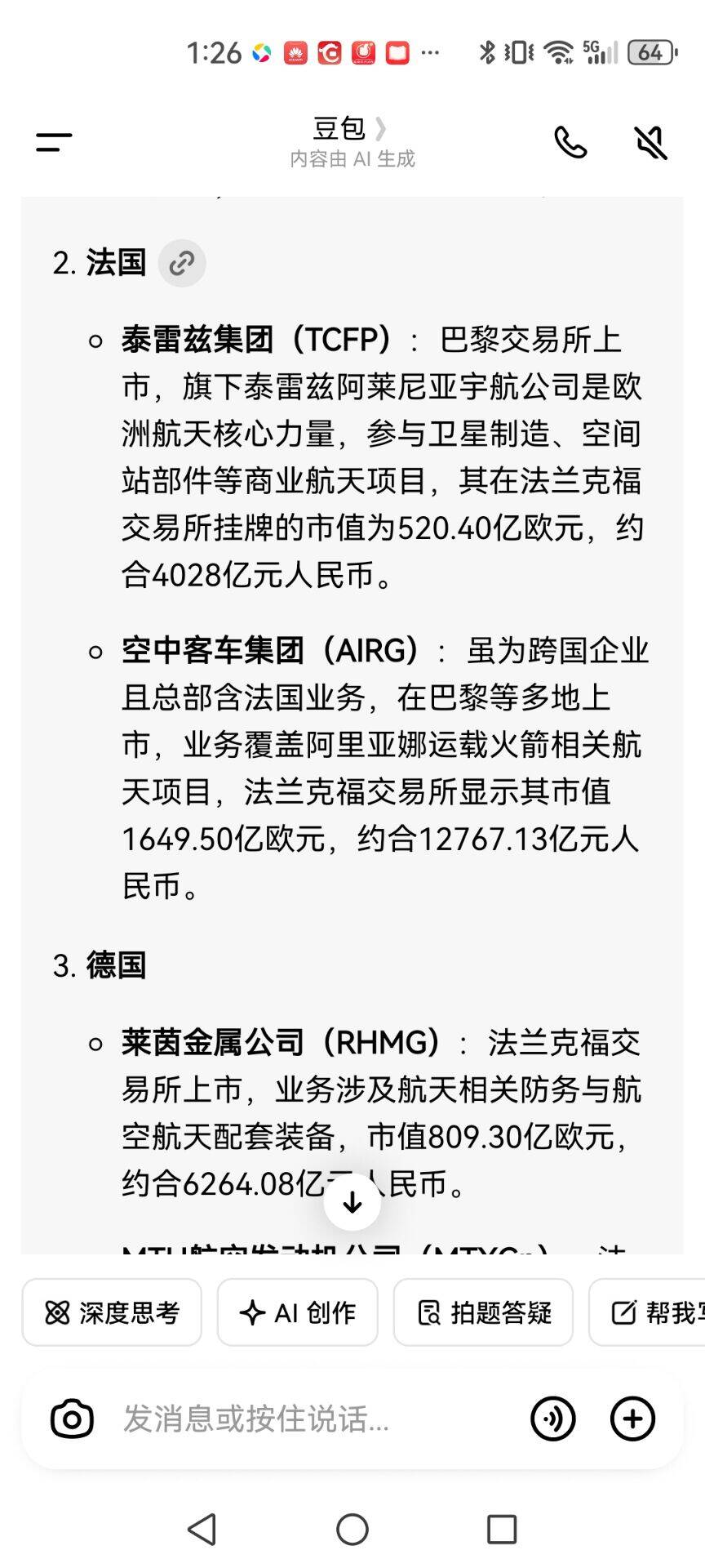 咱国家航天技术世界前三,但咱最大市值的商业航天公司中国卫星市值还不到1000亿人民币,比美国,德国,法国的商业航天公司市值小得多,还有较大上升空间!!