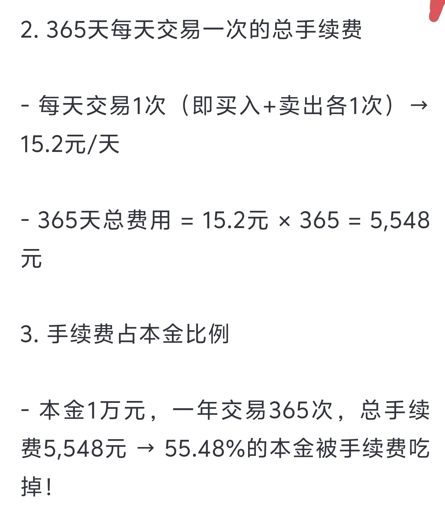 1万块钱每天交易,一年200天,一年手续费将近3600百分比为36%,那就是说你