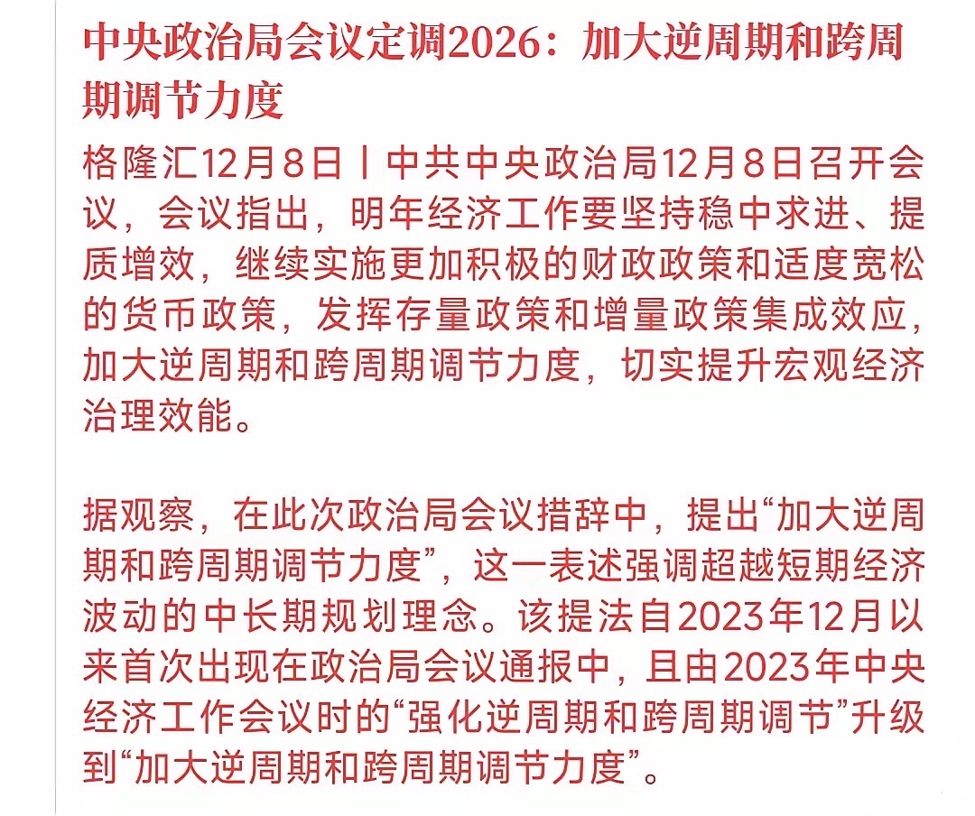 政治局会议的部署为市场吃下“定心丸”,加大逆周期调节与跨周期调节力度将成为2026年宏观经济调控的核心方向。这意味着明年经济运行将维持平稳态势,既不会出现过热现象,也不会陷入过冷局面,始终锚定既定发展目标:当经济呈现过热特征(如通胀高企、投资过热)时,将通过加息、收紧信贷等方式适度降温;当经济面临下行压力(如增长放缓、就业承压)时,则会采取降息、发行国债、扩大基建等举措提振活力。