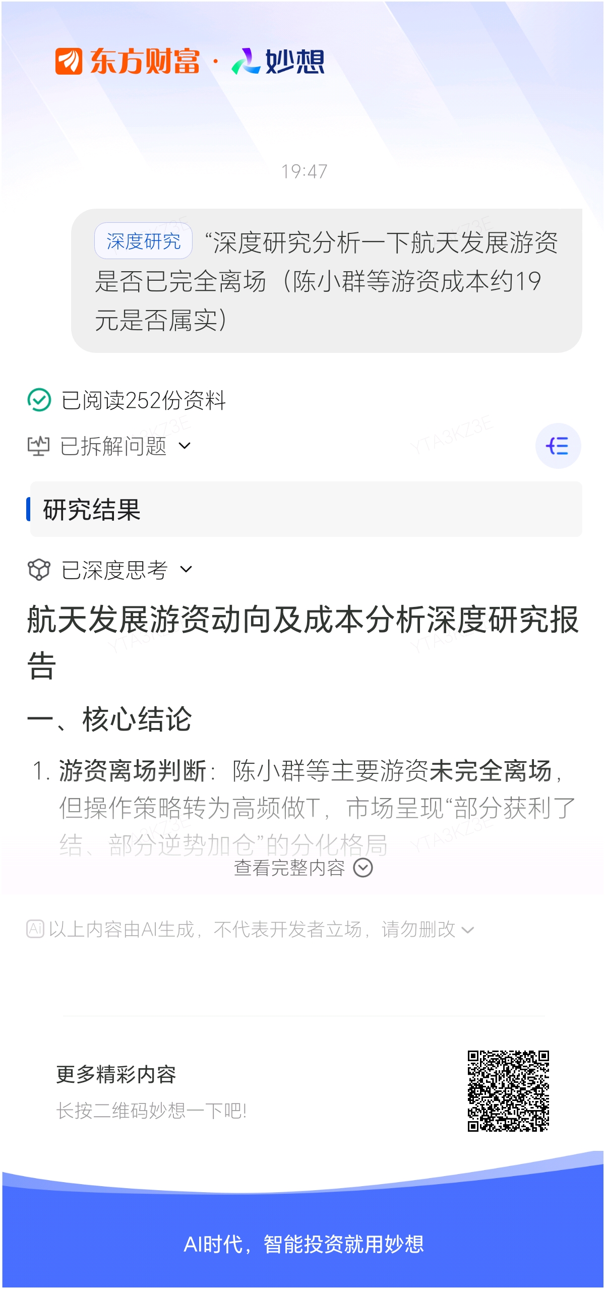 妙想一下:“深度研究分析一下航天发展游资是否已完全离场(陈小群等游资成本约19元